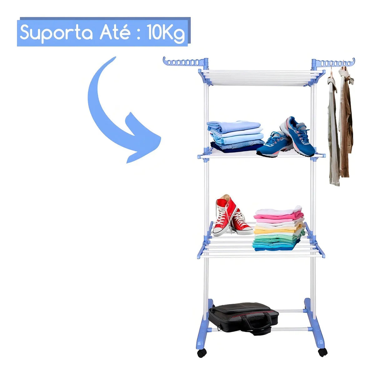 Cuenta con 3 niveles y 2 alas laterales que te ayudarán a colocar tu ropa con una buena cantidad de espacio entre ellos para que puedan secarse completamente. Incluso las alas tienen agujeros para colgar múltiples ganchos.